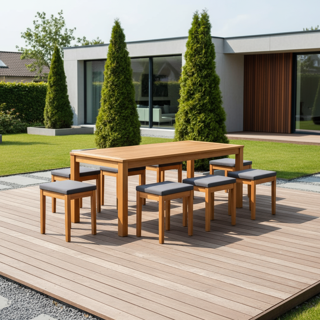 Vira Acacia & Rope Dining Set is a modern outdoor ensemble combining a solid acacia wood table with rope‑woven chairs to create a warm, contemporary dining space for gardens, terraces and patios.