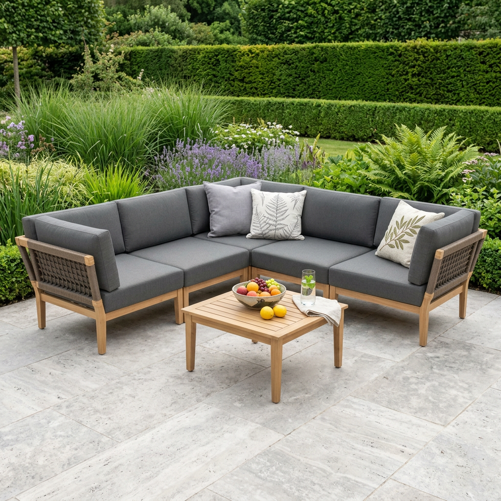 - Modern outdoor corner lounge set designed to fit neatly into garden and terrace corners.