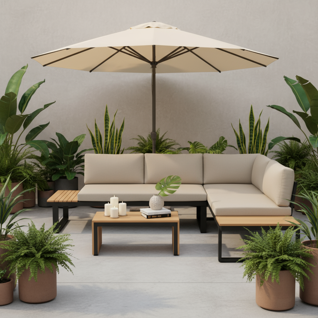 The Harbor Acacia & Metal Outdoor Lounge Set blends a warm acacia wood finish with a streamlined metal frame and deep cushions, creating a contemporary lounge area for modern gardens and terraces.