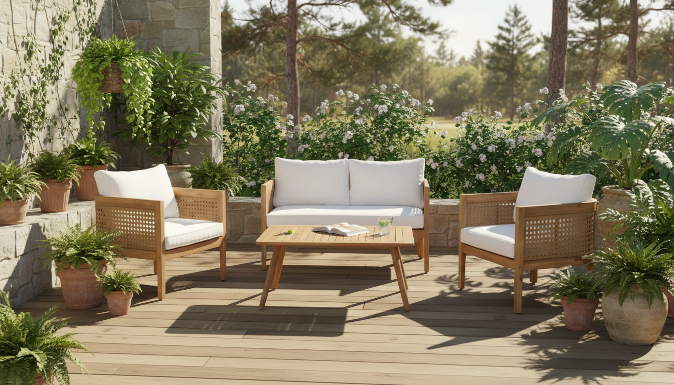 A sophisticated outdoor furniture collection featuring acacia wood frame with contemporary geometric lattice design and premium cushioning. Includes a spacious three-seater sofa, matching armchair, and wooden coffee table - ideal for modern outdoor living spaces.