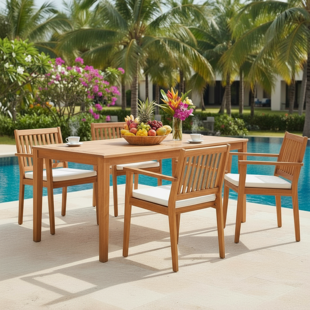 The Sona Acacia Outdoor Dining Set is a contemporary wooden dining ensemble crafted from solid acacia, ideal for modern garden, patio and terrace entertaining.