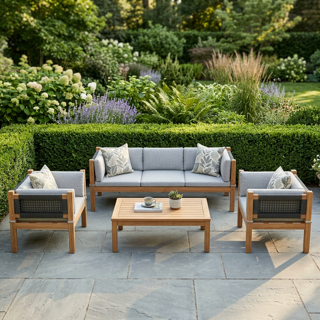 - Modern outdoor sofa set designed for gardens, patios, terraces and poolside areas.